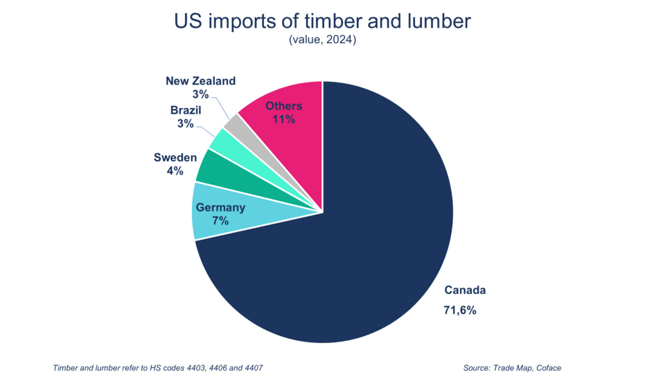 Myös tuontilähteiden osalta muutoksia odotetaan vain vähän. Kanada toimittaa yli 70 % USA:n raakapuun ja sahatavaran tuonnista, joten se on etulinjassa näiden havupuutullien suhteen. Tämä pätee erityisesti, koska 10 %:n tullit ovat lisäys tasoitustulleihin ja polkumyyntitulleihin Ottawan ja Washingtonin välisten kauppasuhteiden kiristyessä. Kanadaan kohdistuvat vaikutukset on kuitenkin arvioitava. Ensinnäkin suuri osa Kanadan puutavaran viennistä on edelleen vapautettu 10 prosentin tullista CUSMA-sopimuksen (Kanada-US-Meksiko) ansiosta, ainakin vuoteen 2026 asti, jolloin sopimus on määrä neuvotella uudelleen. Lisäksi huolimatta kanadalaiselle havupuutavaralle sovellettujen muiden verojen korotuksista, sillä on edelleen selvä etu: vuonna 2024 sen tuontihinta Yhdysvaltojen markkinoilla oli noin 50 % alhaisempi kuin Euroopan unionista peräisin olevan puun tuontihinta. Tullien korotus ei siis riitä poistamaan Kanadan kilpailuetua.